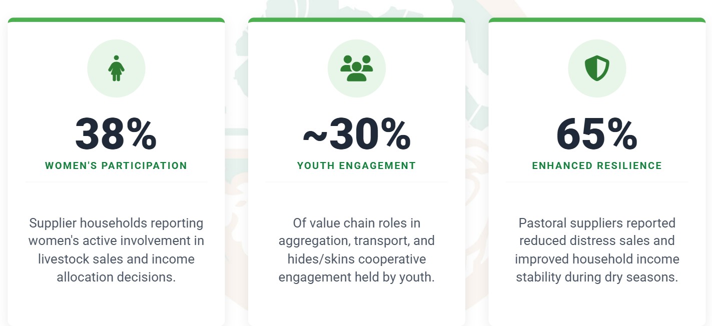 The case study findings demonstrated measurable female participation across livestock and crop organized groups, as well as in capacity-building programs. The validation emphasized that structured market access improved income stability and resilience among pastoral households, and, highlighted the importance of deliberate inclusion strategies to ensure women, youth, and smallholder producers benefit from export growth.